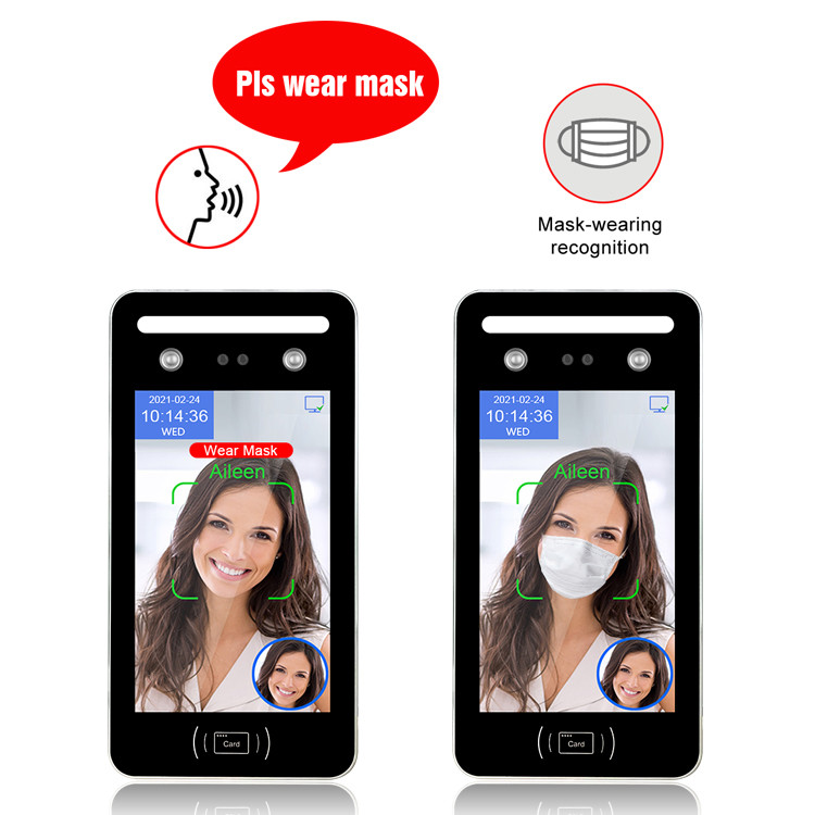 फेस रिकग्निशन अटेंडेंस मशीन सपोर्ट मास्क फेस रिकग्निशन डिटेक्शन पहने हुए, जब आप फेस मास्क नहीं पहनते हैं, तो डिवाइस कहेगा कि Pls फेस मास्क पहनें।फेस रिकग्निशन एक्सेस कंट्रोल सिस्टम इंफ्रारेड कैमरा के साथ लाइव डिटेक्शन फंक्शन को सपोर्ट कर सकता है।